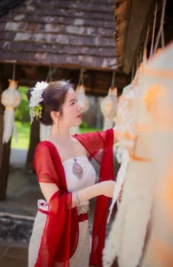 นอกจากนี้ เครื่องแต่งกายของเธอสะท้อนรสนิยมที่เรียบง่ายแต่มีชั้นเชิง ชุดเดรส สายเดี่ยว สีเอิร์ธโทนดูนุ่มนวล และ สุภาพ เนื้อผ้าที่ทิ้งตัวอย่างสวยงามแนบรับกับสรีระ อย่างพอดี เผยให้เห็นรูปร่างที่อ่อนช้อยโดยไม่จำเป็นต้องเน้น ความเซ็กซี่ ชุดนี้ทำหน้าที่เป็นกรอบที่ช่วยขับความงามของเธอให้เด่นขึ้น